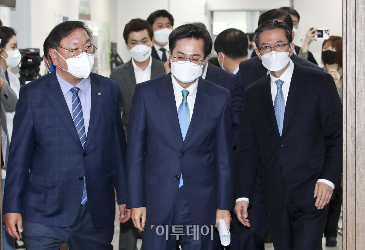 더불어민주당 김동연 경기지사 후보와 김태년, 정성호 의원이 26일 오전 서울 여의도 국회에서 열린 정견 및 정책발표 기자회견에 참석하고 있다.