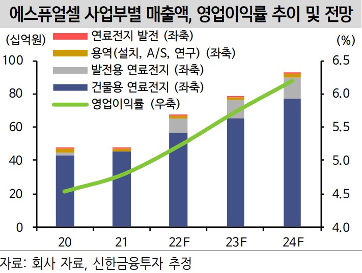 최규헌 신한금융투자 연구원은 “에스퓨얼셀은 국내 유일 수소 에너지 팹리스 업체로 건물·발전용 연료전지, 용역, 연료전지 발전으로 매출이 구분돼 있고 자회사 에스모빌리티솔루션을 통해 수소 모빌리티 시장 진입을 추진 중”이라며 “분산 전원 확대, 의무 시장 성장 등으로 국내 건물용 연료전지 시장은 연평균 18% 성장할 전망이라 국내 건물용 1위 업체로 직접적인 수혜가 예상된다”고 했다.