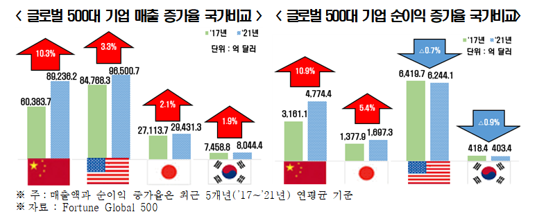 27일 전국경제인연합회에 따르면 한국은 최근 5년간 매출액과 순이익 증가율 모두 주요 4개국 중 꼴찌였다. 글로벌 500대 기업 내 한국 기업의 합산 매출액은 2017년 7458.8억 달러에서 2021년 8044.4억 달러로 연평균 1.9% 성장했는데, 이는 같은 기간 중 중국(10.3%), 미국(3.3%), 일본(2.1%)보다 부진했다.