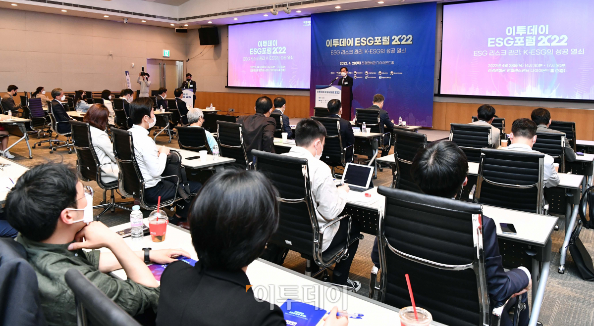 박진규 산업통상자원부 제1차관이 28일 서울 여의도 전경련회관 다이아몬드홀에서 열린 ‘이투데이 ESG포럼 2022’에서 축사를 하고 있다. ESG는 기업의 비재무적 요소인 환경(Environment)·사회(Social)·지배구조(Governance)를 뜻하는 말로 이투데이가 주최한 ESG포럼 2022는 ESG경영을 실천하는 국내 기업들에게 ESG 리스크 관리에 대한 중요성을 알리고, 리스크 관리 전략의 해법 제시를 위해 전문가들의 의견을 듣는 자리다.