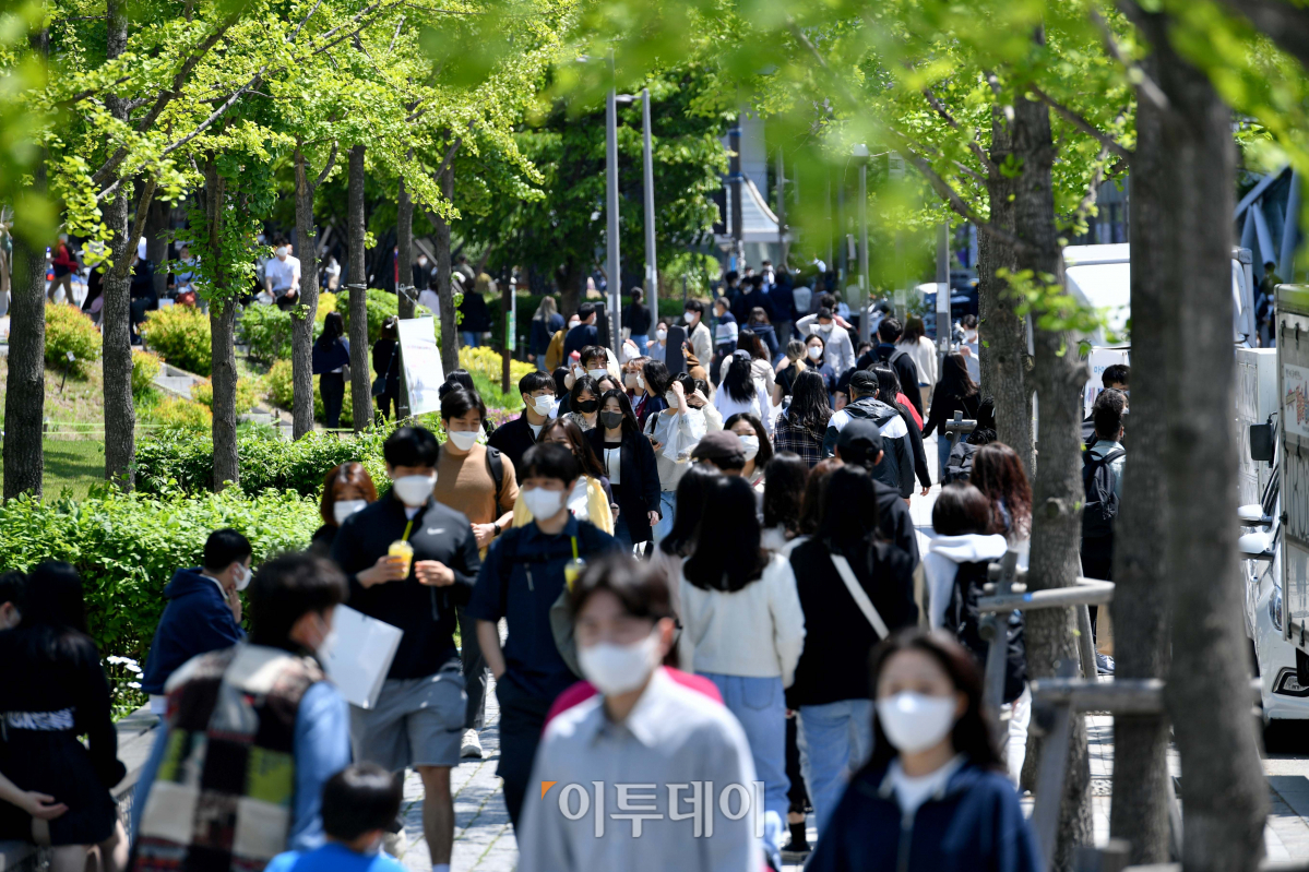 실외 마스크 착용 의무 해제를 하루 앞둔 1일 서울 마포구 경의선숲길이 봄나들이를 나온 시민들로 붐비고 있다.