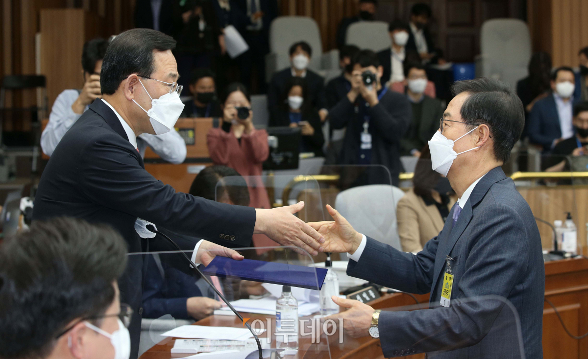 한덕수 국무총리 후보자가 2일 오전 서울 여의도 국회에서 열린 인사청문회에서 선서 직후 선서문을 주호영 위원장에게 제출하고 있다.