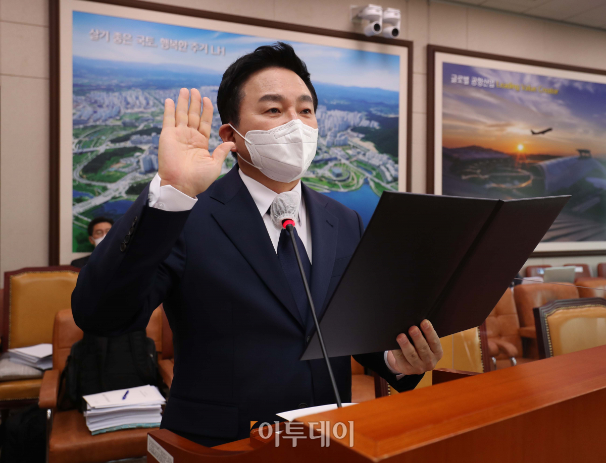 원희룡 국토부장관 후보자가 2일 서울 여의도 국회 국토교통위원회 회의실에서 열린 국토부장관 후보자 인사청문회에서 선서하고 있다.
