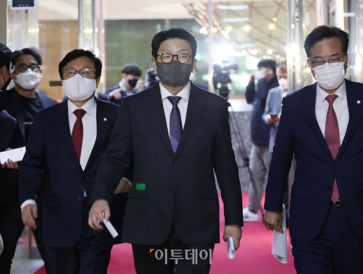 권성동 국민의힘 원내대표가 2일 박병석 국회의장과의 면담을 위해 의장실로 향하고 있다.