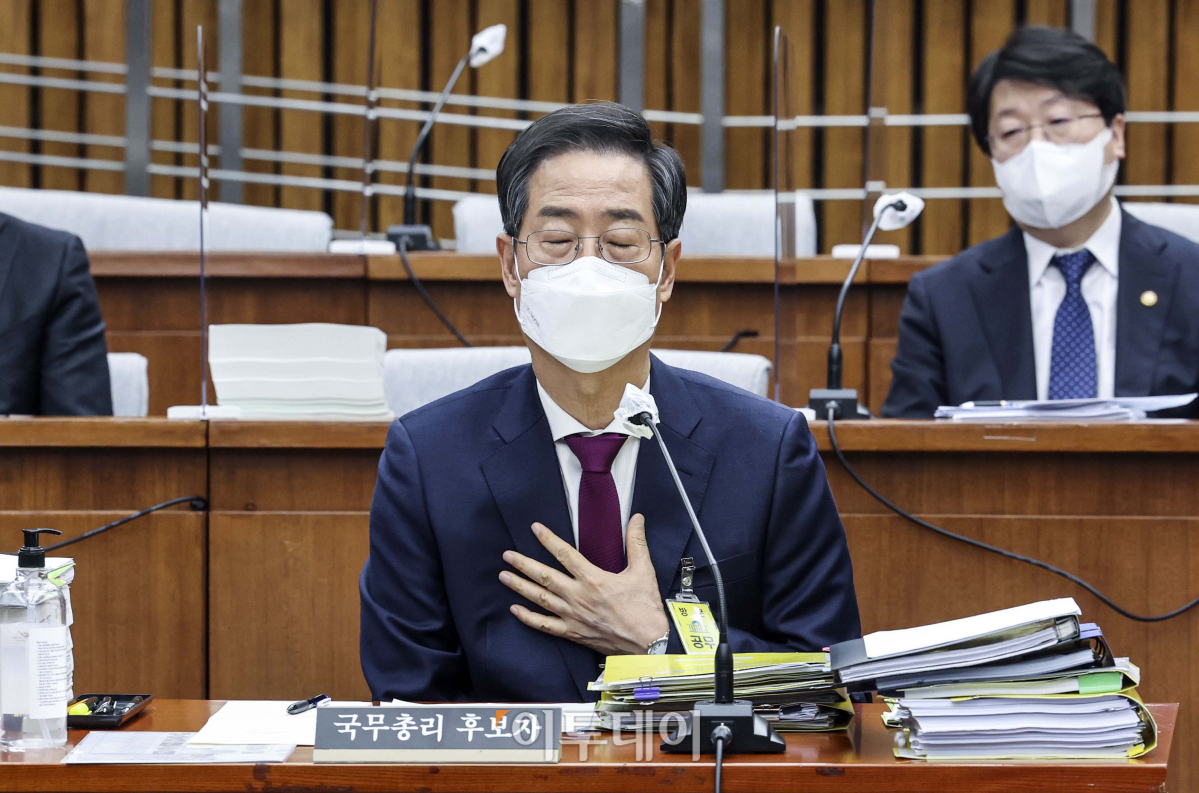 한덕수 국무총리 후보자가 3일 서울 여의도 국회에서 열린 인사청문회에 출석해 의원들의 질의에 답변하고 있다.