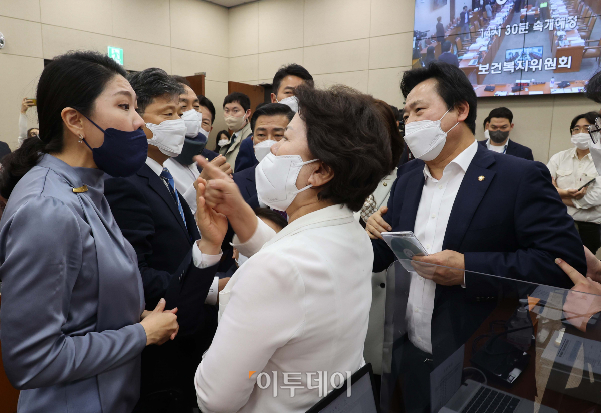 신현영 더불어민주당 의원(맨 왼쪽)과 서정숙 국민의힘 의원이 3일 오전 서울 여의도 국회에서 열린 정호영 보건복지부 장관 후보자 인사청문회에서 정 후보자가 제출한 아들의 MRI 자료 놓고 실랑이를 벌이고 있다.