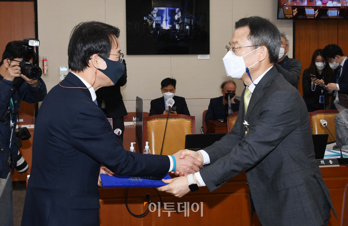 이종호 과학기술정보통신부 장관 후보자가 3일 국회 과방위에서 열린 인사청문회에서 선서문을 이원욱 과방위원장에게 제출 하고 있다.