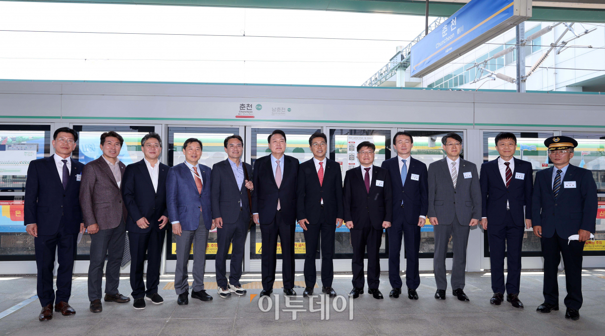 윤석열 대통령 당선인(왼쪽 여섯 번째)이 4일 강원 춘천역을 방문해 철도 인프라 구축 현장을 점검한 뒤 참석자들과 기념촬영을 하고 있다. 윤 당선인은 GTX-B 노선 춘천 연장과 춘천과 속초를 잇는 동서고속화철도의 조기 완공 등 대선 주요 공약의 이행을 약속하고 현장을 점검했다. 인수위사진기자단
