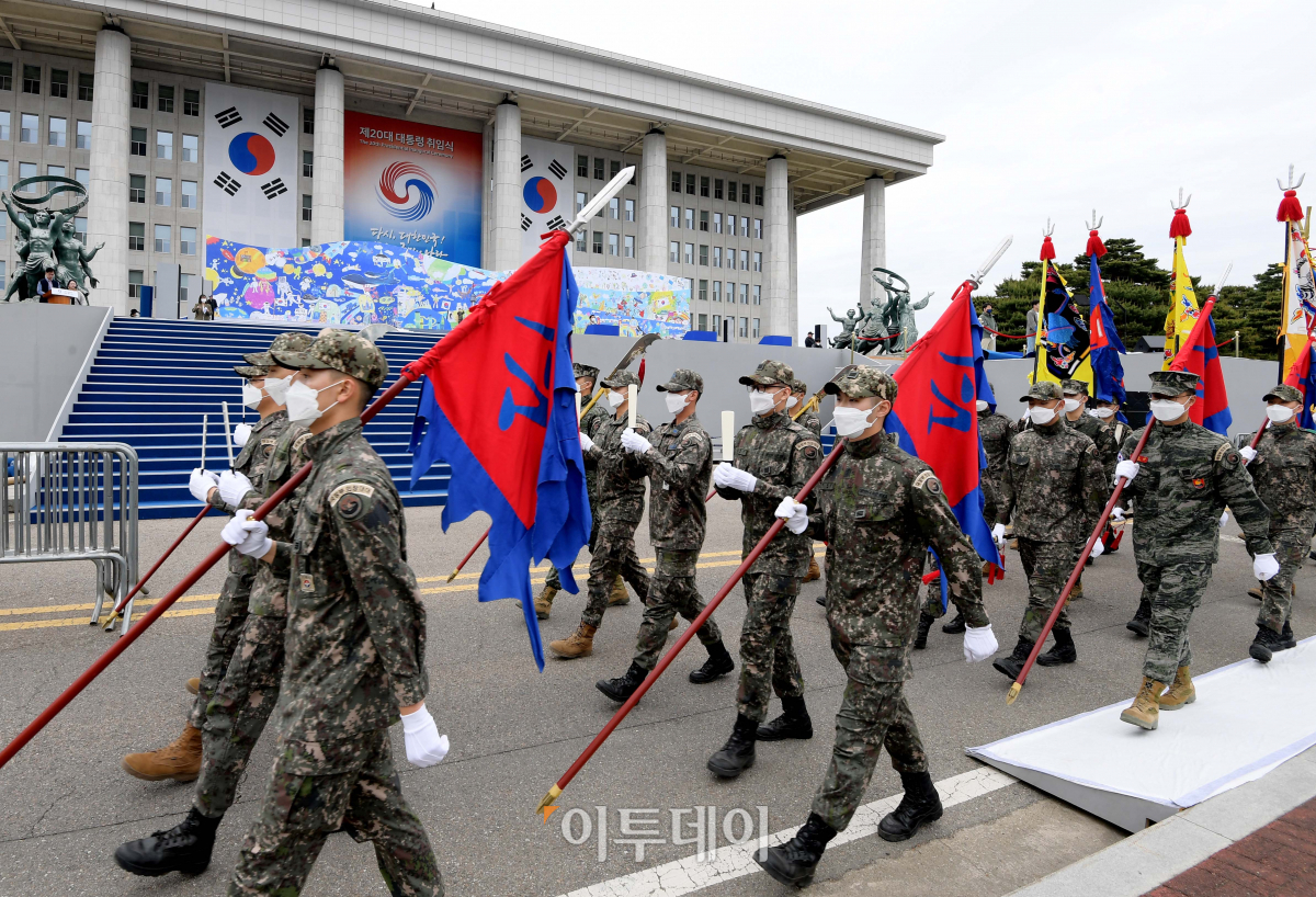 제20대 대통령 취임식을 이틀 앞둔 8일 국회 본관 앞에서 국방부의장대가 리허설을 하고 있다.
