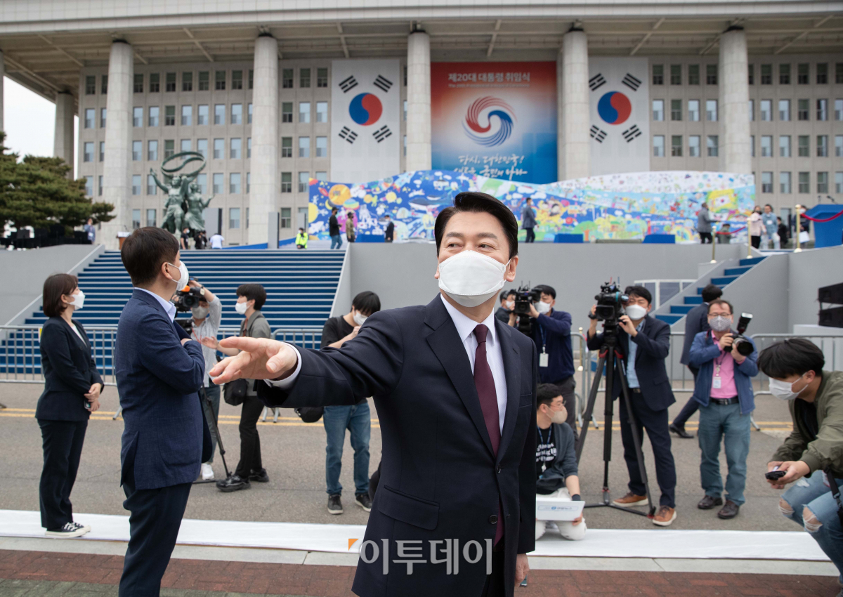 안철수 대통령직인수위원장이 8일 오후 서울 여의도 국회 본청 앞에 설치된 제20대 대통령취임식장을 찾아 현장점검하고 있다.