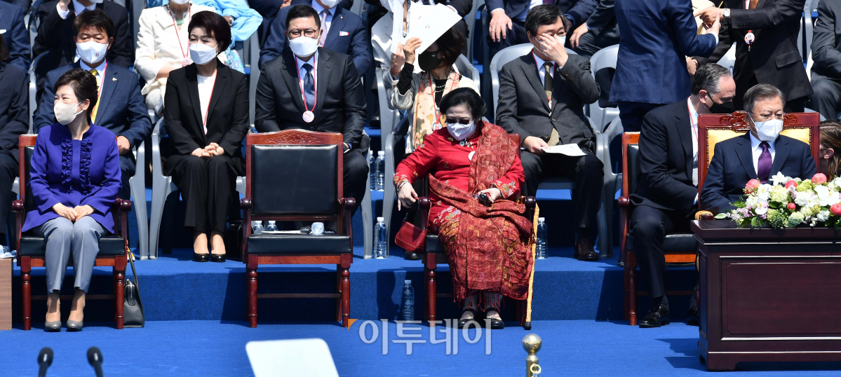 박근혜 전 대통령과 문재인 전 대통령이 10일 서울 여의도 국회에서 열린 취임식에서 자리에 앉아 있다.