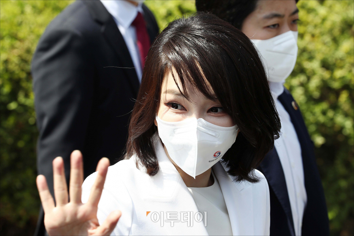 윤석열 대통령의 부인 김건희 여사가 10일 오전 서울 여의도 국회에서 열린 제20대 대통령 취임식에 참석하며 참석자들을 향해 손을 들어 인사를 하고 있다. 국회사진취재단
