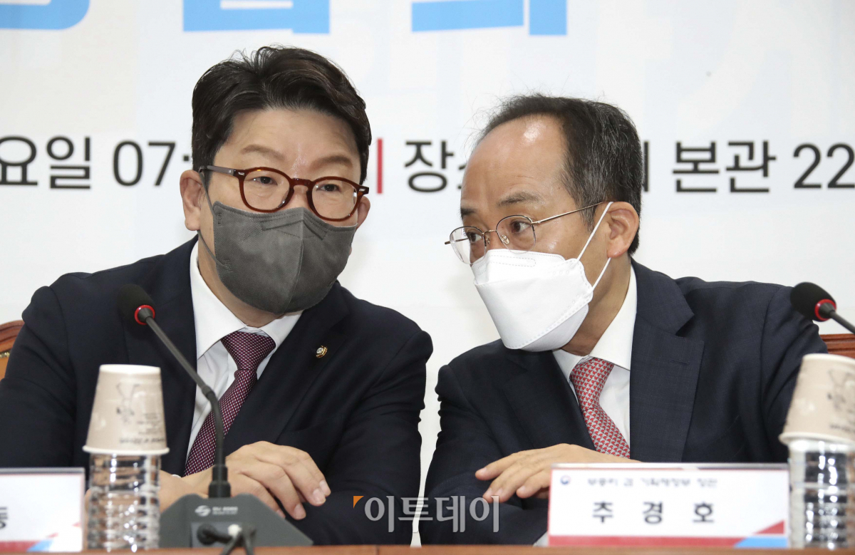 권성동 국민의힘 원내대표(왼쪽)와 추경호 부총리 겸 기획재정부 장관이 11일 서울 여의도 국회에서 소상공인 손실보상 등에 관련된 2차 추경 편성을 다루는 당정 협의에 앞서 이야기를 나누고 있다.