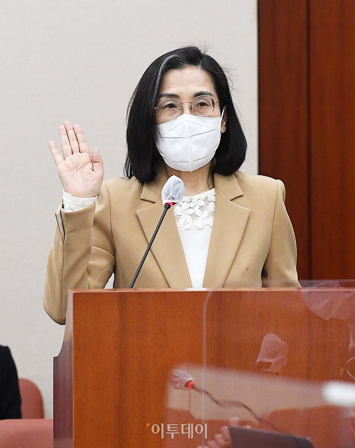김현숙 여성가족부 장관 후보자가 11일 오전 서울 여의도 국회 여성가족위원회에서 열린 인사청문회에서 선서를 하고 있다.