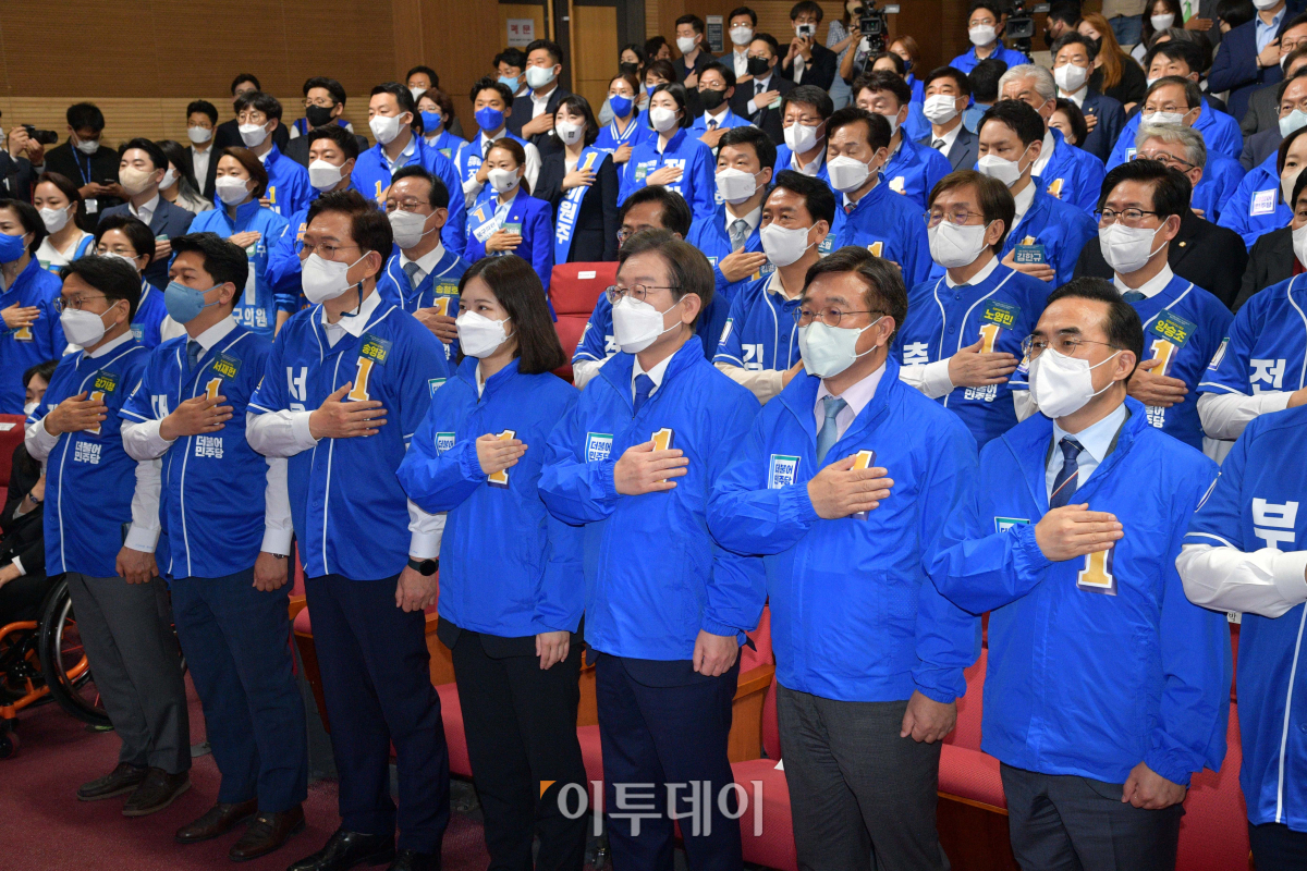 11일 오전 서울 여의도 국회 의원회관에서 열린 더불어민주당 제8회 전국동시지방선거 및 재보궐선거 통합선거대책위원회 출범식에서 이재명 총괄선대위원장을 비롯한 지방선거 후보자들이 국민의례를 하고 있다.