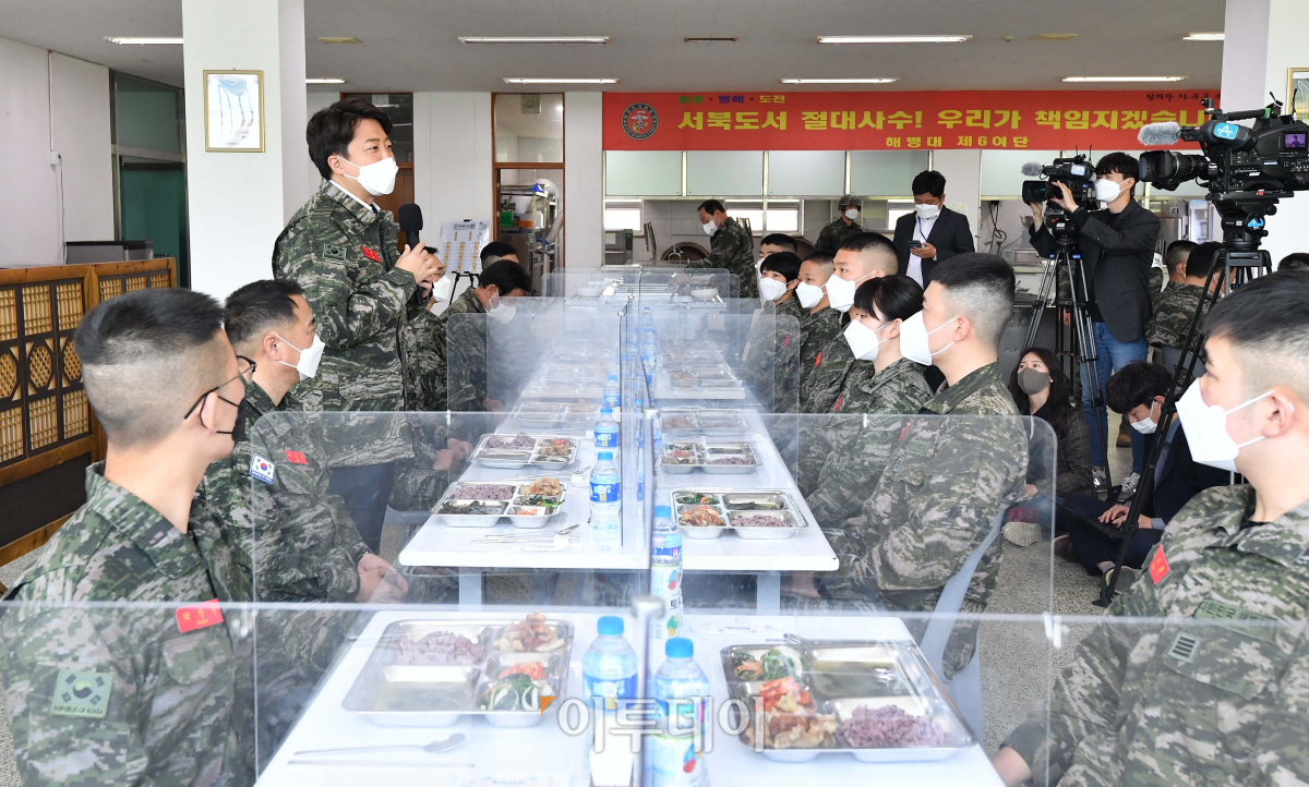 이준석 국민의힘 대표가 11일 인천 옹진군 백령도 해병대 제6여단을 방문해 장병들을 향해 격려 발언을 하고 있다. 국회사진취재단