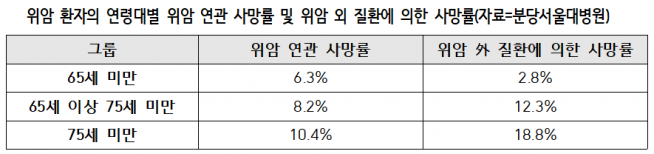 분당서울대병원 소화기내과 김나영 교수 연구팀(제 1저자 소화기내과 최용훈 교수)은 최근 대규모 데이터 분석을 통해 위암 환자의 연령대가 증가할수록 위암 연관 사망률이 높아지지만 합병증 등 위암 이외 질환에 의한 사망률의 상승폭은 이보다 훨씬 가파른 것으로 나타났다고 밝혔다.