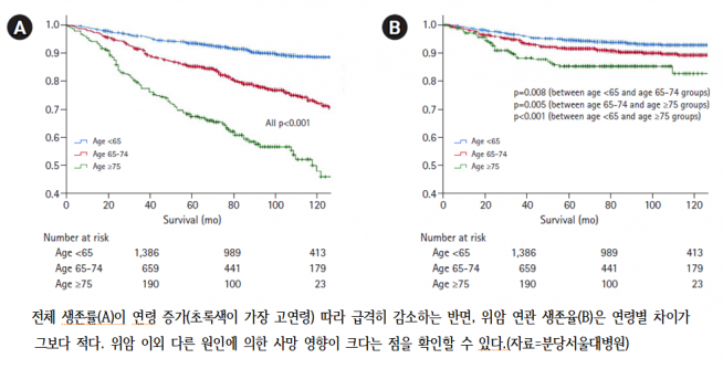 고령층 위암 환자는 위암 자체보다 심뇌혈관질환과 폐질환 등 암 외 기저질환에 의한 사망률 증가가 빠르다는 연구결과가 나왔다. 따라서 치료 지침 사각지대의 초고령 위암 환자에 대한 진단과 치료지침 확립이 필요하다는 의견이다.