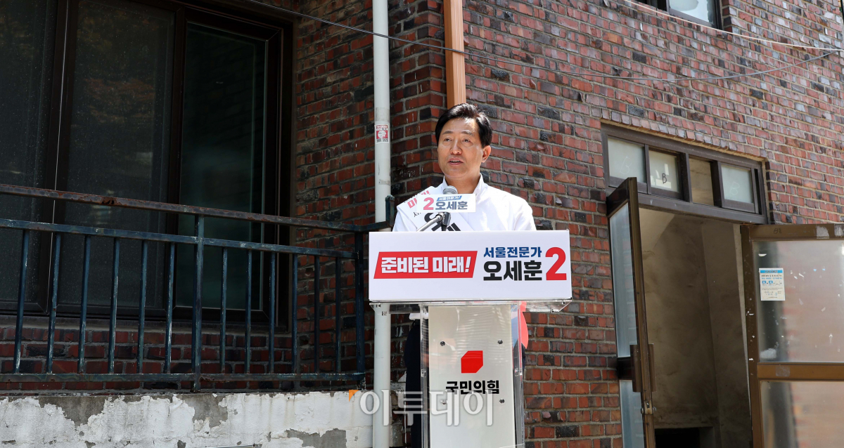 오세훈 서울시장이 12일 서울 구로구 고척동에서 서울시장 선거 출마를 선언하고있다. 국회사진취재단