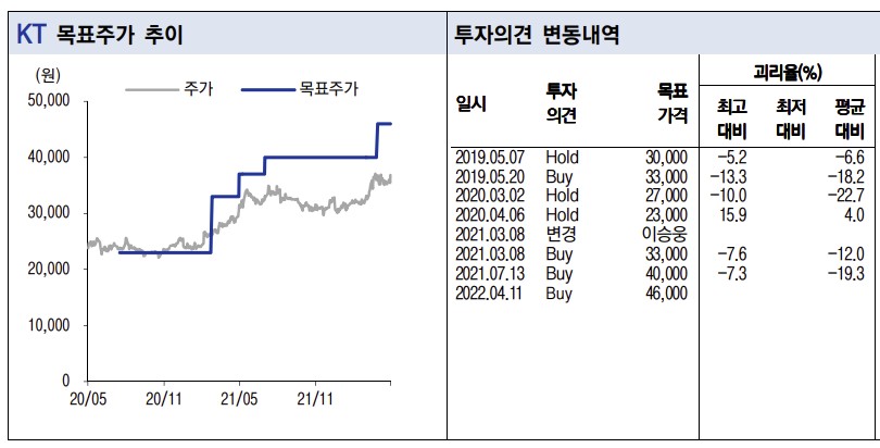 KT의 주당배당금(DPS)도 상향했다. 이 연구원은 "이익 추정치 변경을 반영해 22년 예상 DPS를 2100원에서 2300원으로 상향한다"며 "현 주가 기준 배당수익률은 6.2%, 12개월 주가 주당순자산배율(12M Fwd PBR)은 0.57배이다. 10년 이후 최대 실적이 예상되는 가운데 배당수익률과 PBR 모두 역사적 평균을 하회하는 저평가된 상태"라고 덧붙였다.
