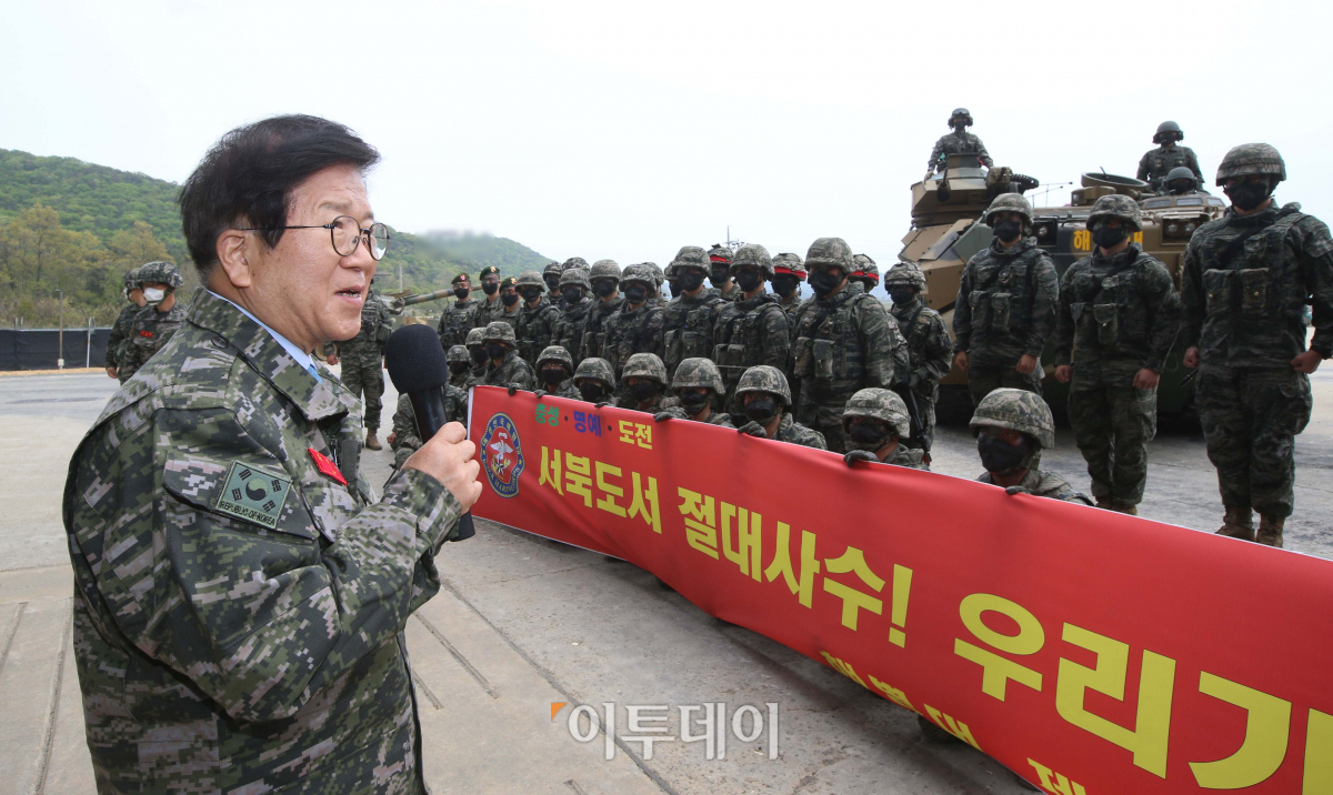 박병석 국회의장이 13일 오후 인천 옹진군 백령도 해병대 제6여단 흑룡리더십훈련장을 방문해 훈련을 참관한 뒤 장병들을 격려하고 있다. 국회사진취재단