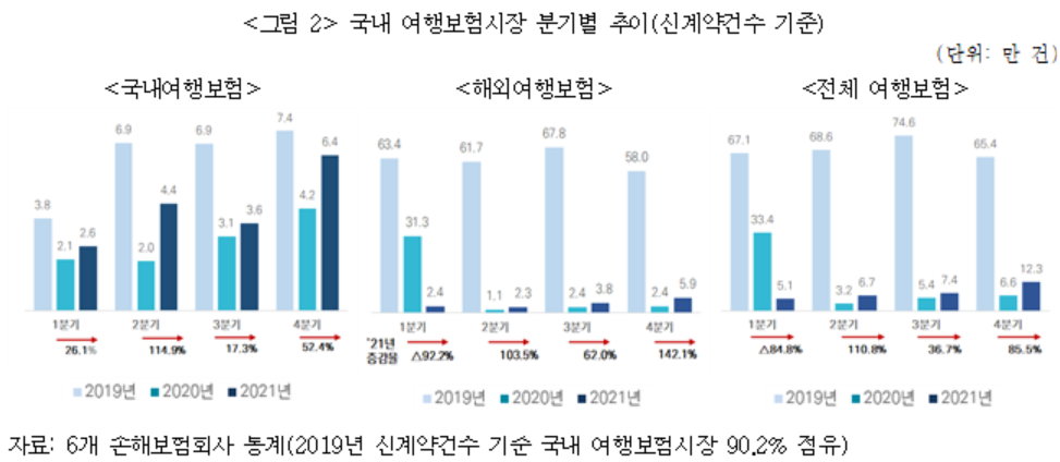 지난해 국내여행보험 신계약건수는 17만 91건으로 2020년(11만 3915건) 대비 49.3% 증가하면서 높은 회복세를 나타냈으며, 국내여행보험 원수보험료는 49억 원으로 2020년(38억 원) 대비 소폭 증가했다.