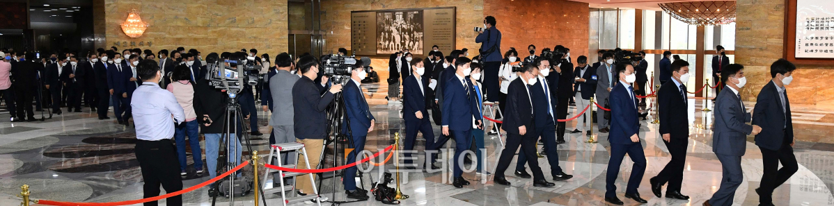 더불어민주당 의원들이 16일 서울 여의도 국회에서 열린 의원총회에 참석한 후 윤석열 대통령의 ‘추경안 시정연설’을 듣기 위해 본회의장으로 이동하고 있다.