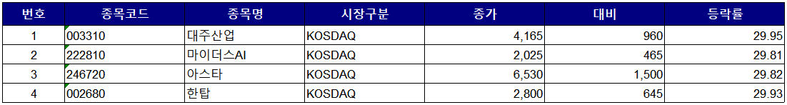 16일 코스닥 시장에선 4개 종목이 상한가를 기록했다. 1개 종목이 하한가를 기록했다.