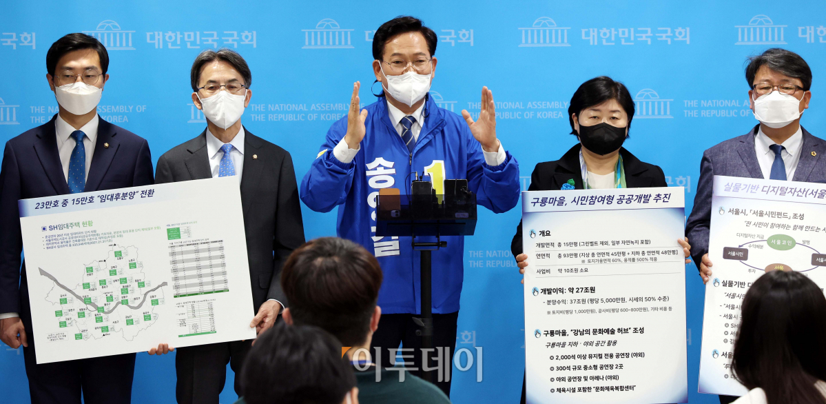 송영길 더불어민주당 서울시장 후보가 18일 서울 여의도 국회 소통관에서 부동산 관련 공약 발표 기자회견을 마친 뒤 기자들의 질문에 답하고있다.