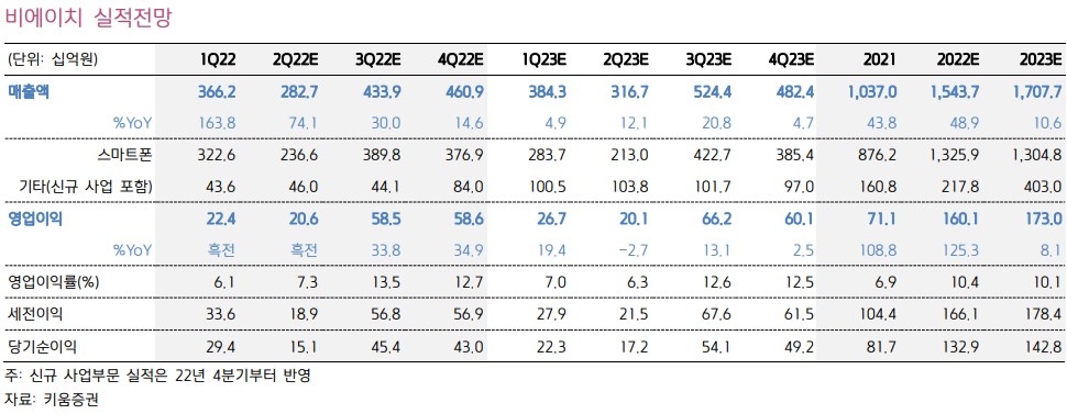 오현진 키움증권 연구원은 “기존의 예상과 달리 2분기 북미 고객사 향 물량 감소 우려로 인한 실적 둔화는 없을 것”이라며 “최근 전반적인 스마트폰 수요 둔화에도 프리미엄 제품군 수요는 견고하게 유지되고 있고, 전통적인 비수기임에도 북미 고객사는 아이폰13 상위 라인업 생산 계획을 2분기 증산한 것으로 파악된다”고 했다.