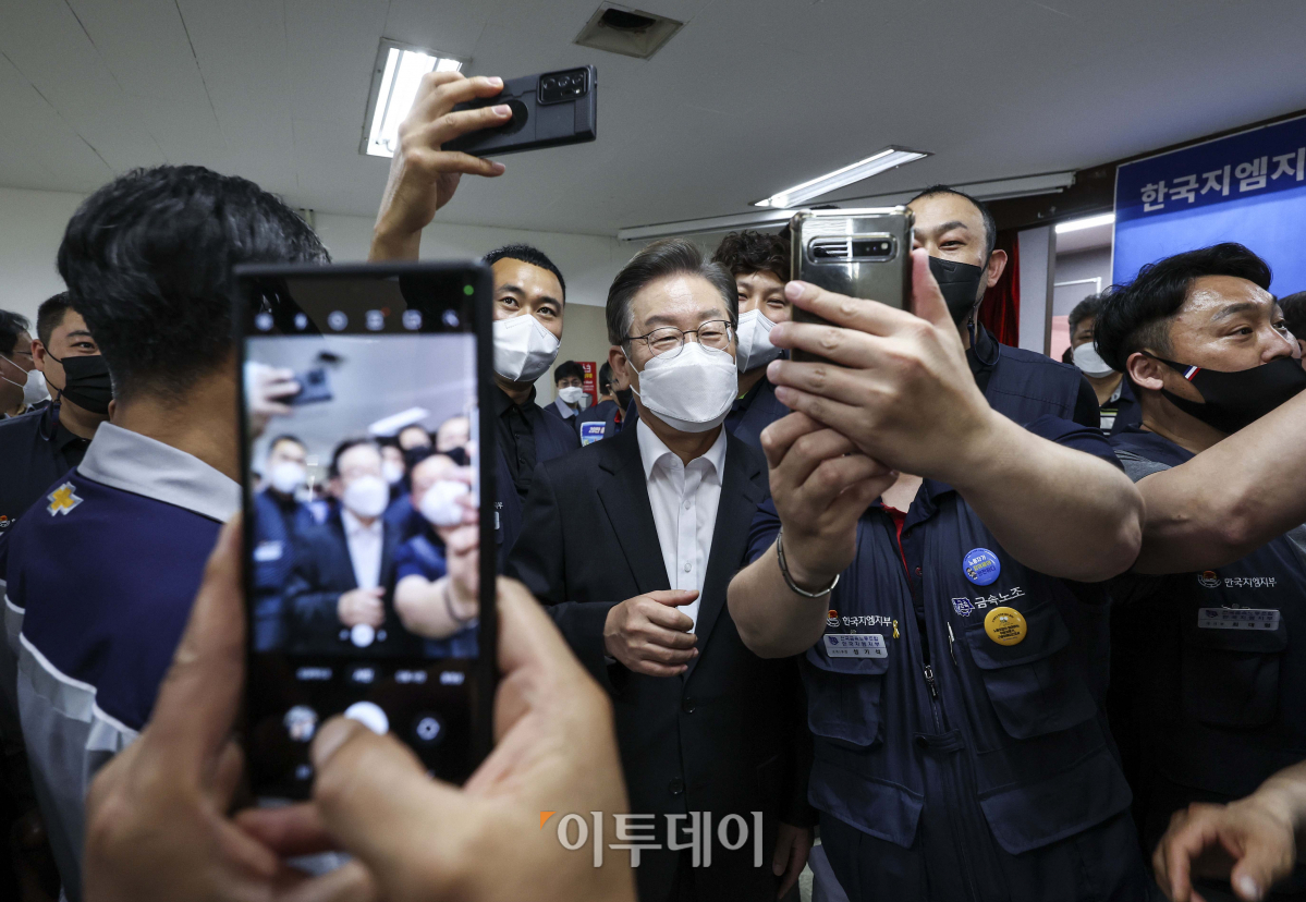 이재명 더불어민주당 총괄상임선대위원장 겸 인천 계양을 국회의원 보선 후보가 19일 인천 부평구 한국지엠 부평공장에서 '한국지엠 미래 발전과 고용안정을 위한 정책협약식'을 가졌다. 이 위원장이 협약식을 마친 후 노조원들과 기념사진을 찍고 있다. 국회사진취재단