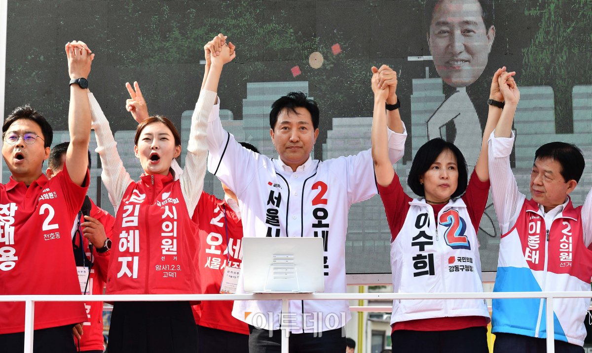 오세훈 국민의힘 서울시장 후보가 22일 서울 강동구 광진교 남단사거리 앞에서 시민들에게 지지를 호소하고 있다.