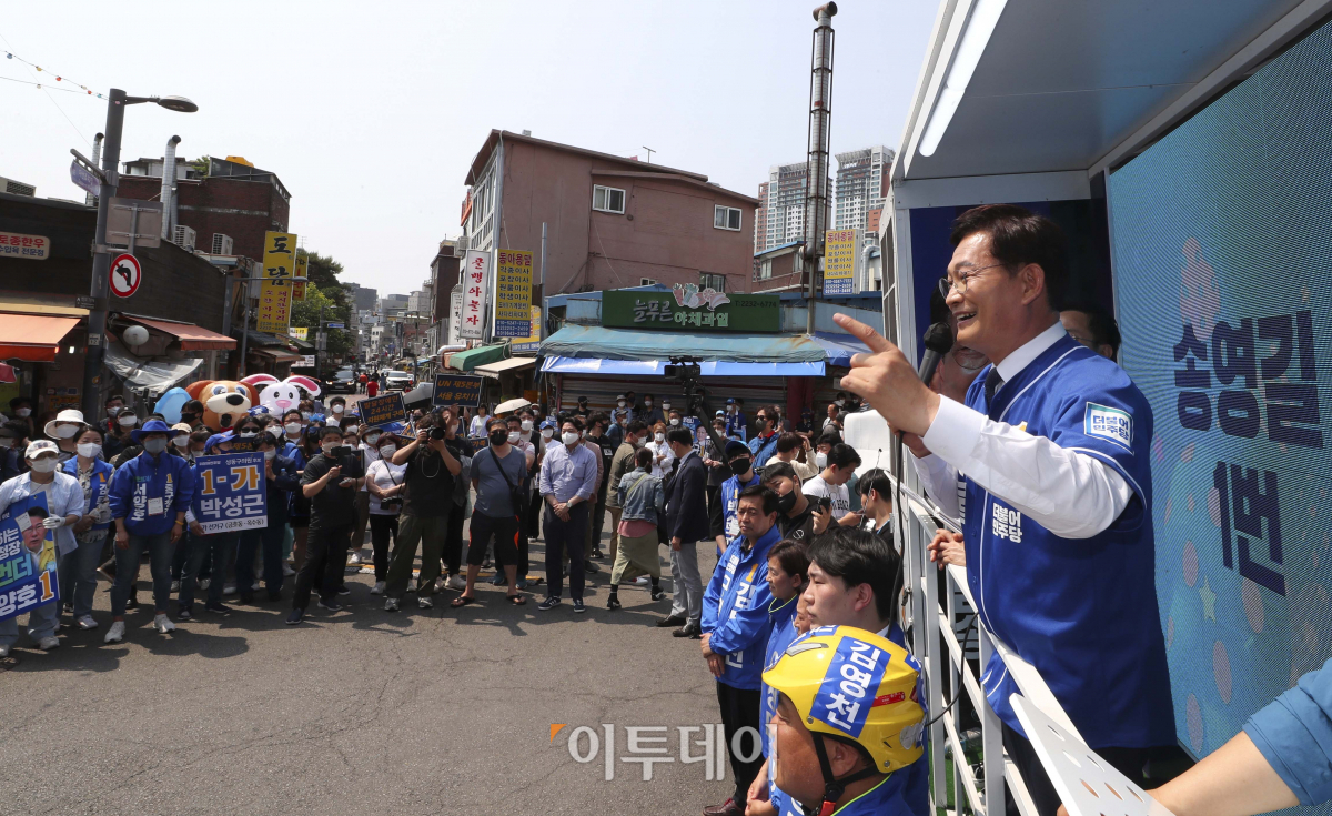 송영길 더불어민주당 서울시장 후보가 22일 오후 서울 중구 백학시장에서 열린 유세에 참석해 지지를 호소하고 있다.