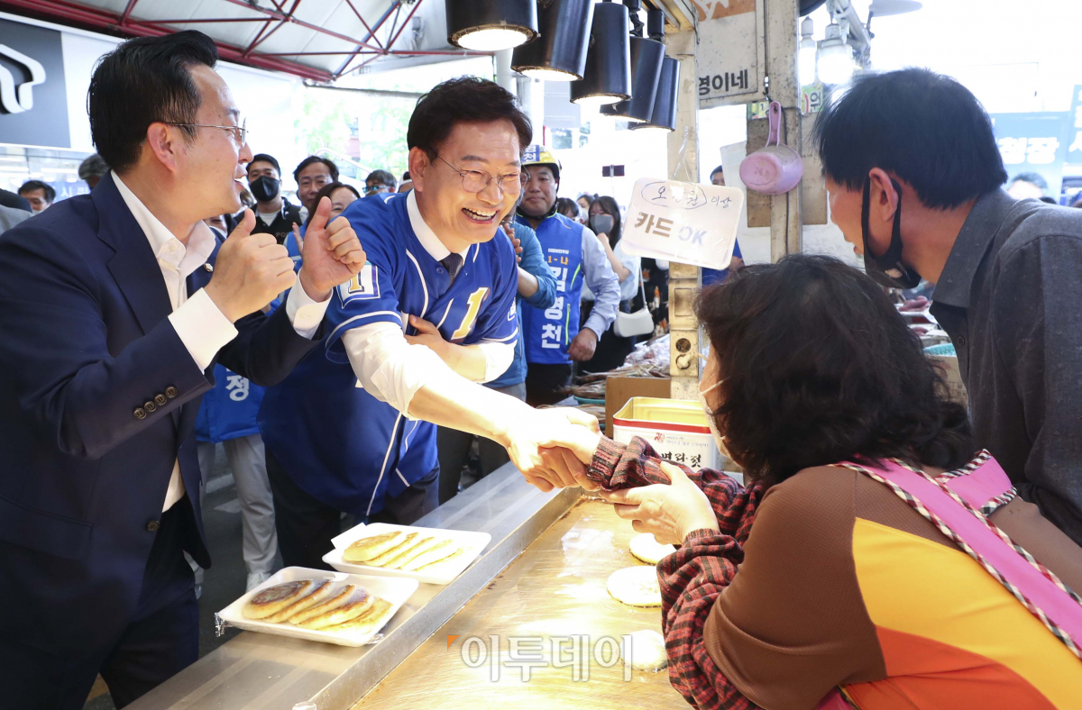 송영길 더불어민주당 서울시장 후보가 22일 오후 서울 중구 중앙시장을 찾아 상인과 인사를 나누고 있다.
