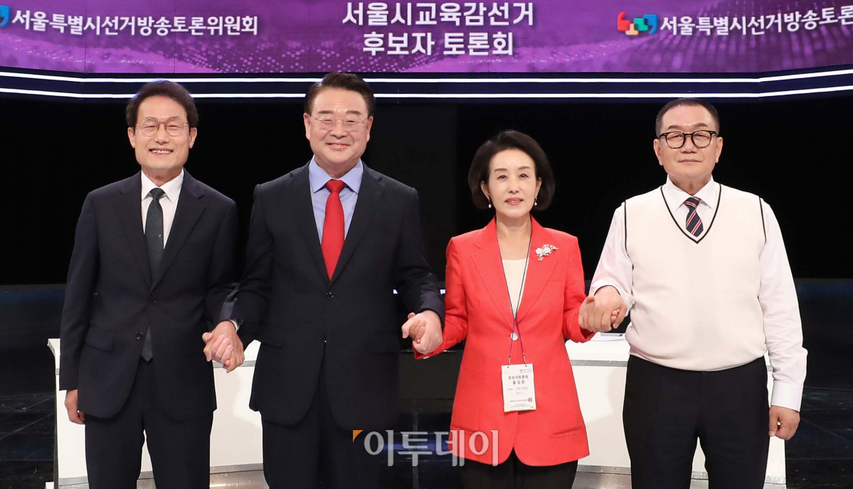 조희연(왼쪽부터), 조전혁, 박선영, 조영달 서울시교육감 후보들이 23일 오전 서울 영등포구 KBS에서 열린 서울시교육감선거 후보자 토론회에 앞서 기념촬영을 하고 있다. 국회사진취재단