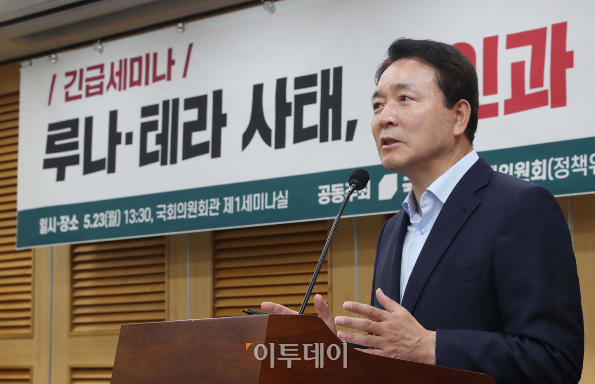 국민의힘 성일종 정책위의장이 23일 오후 국회 의원회관에서 '루나·테라 사태, 원인과 대책'을 주제로 열린 긴급세미나에서 인사말을 하고 있다.