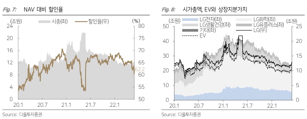 이날 김한이 다올투자증권 연구원은 LG에 대해 "안정적 지분가치대비 저평가가 크고, LG CNS의 실적 증가가 우수하며, 향후 배당 확대가 기대된다"고 전망했다.