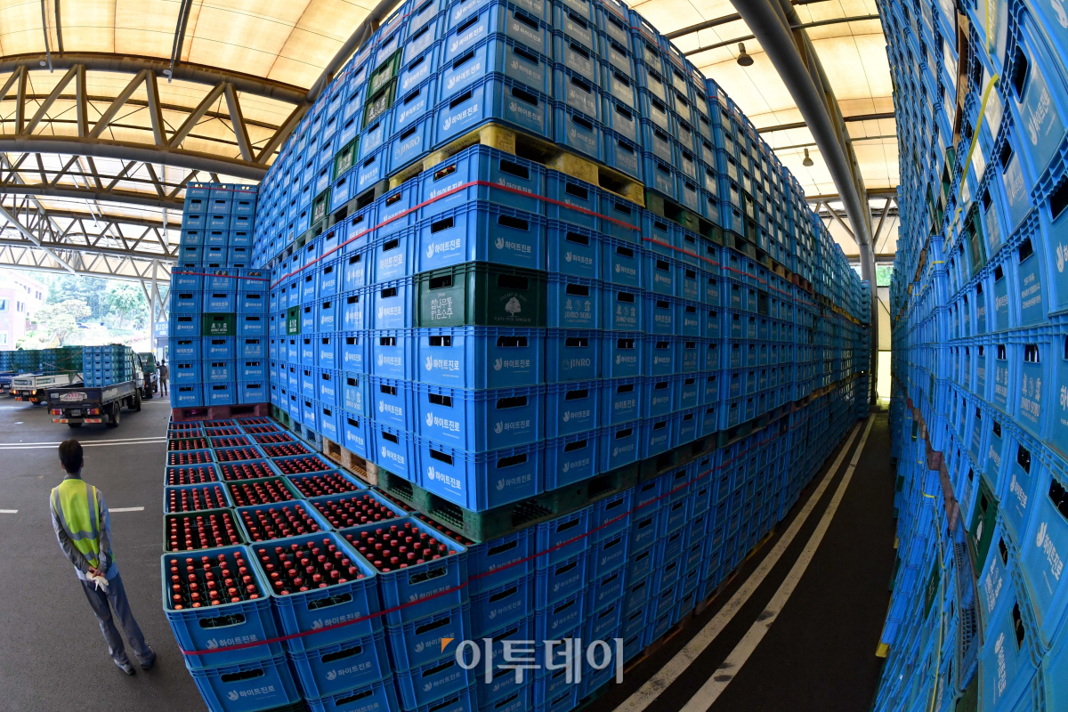 민주노총 공공운수노조 화물연대 총파업 이틀째인 8일 경기 이천시 하이트진로 이천공장에 출고되지 못한 제품들이 쌓여있다.