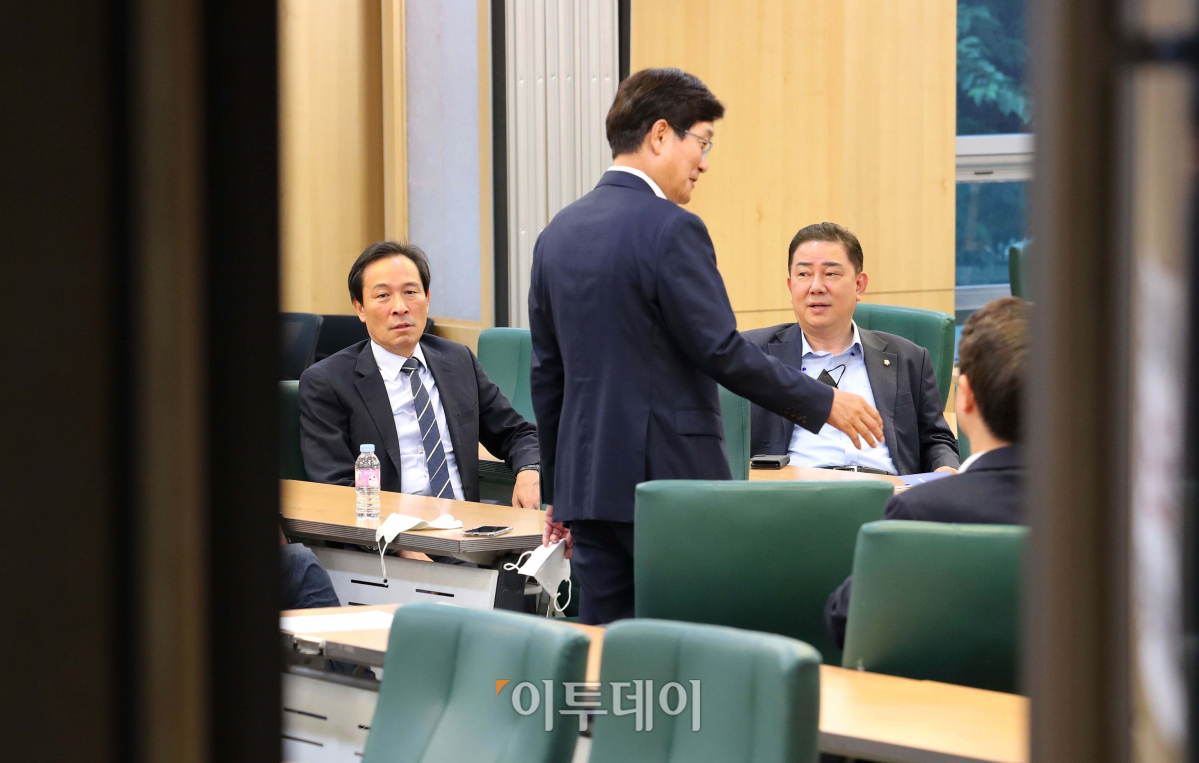 더불어민주당 우상호 비대위원장이 9일 서울 여의도 국회의원회관에서 재선의원 10여명과 당쇄신 관련 간담회를 갖고 있다.