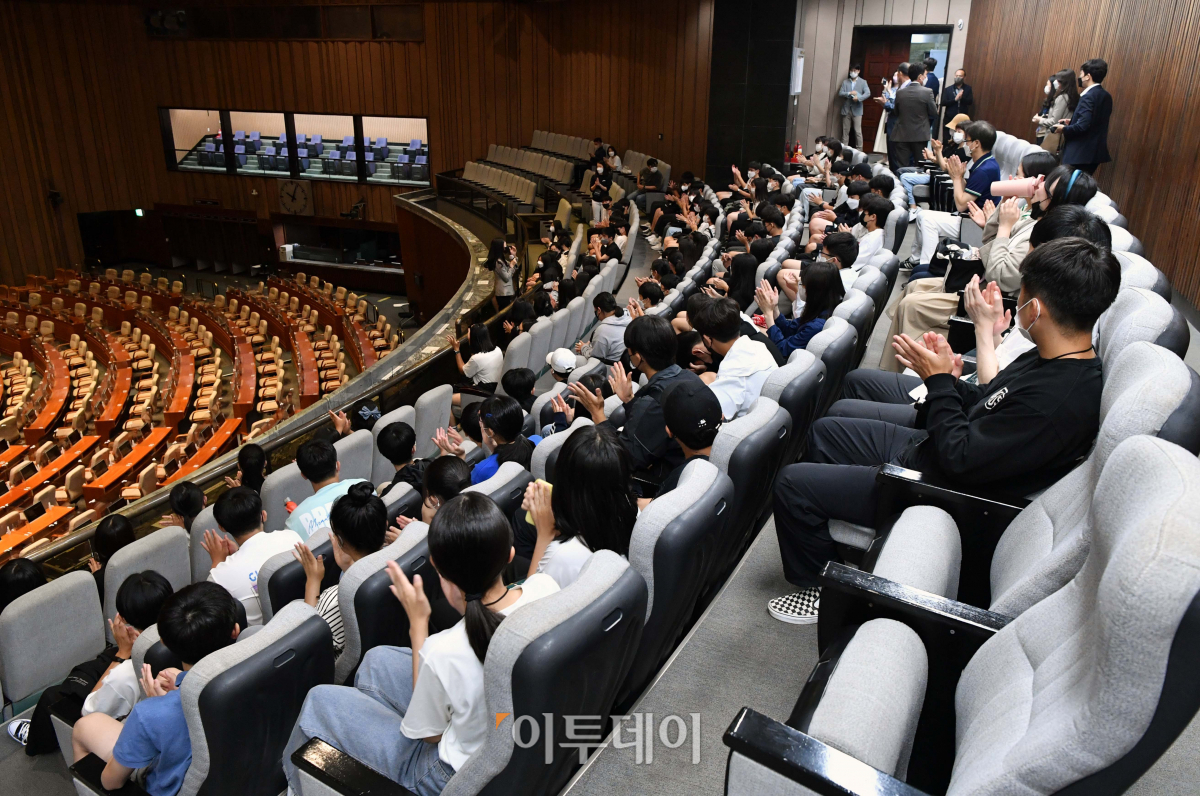 원구성 협상 난항으로 국회 공백 상태가 장기화되는 가운데 9일 국회를 참관한 학생들이 텅 빈 본회의장에서 관계자의 설명을 듣고 있다. 국회는 지난 7일부터 일반인 본회의장 참관을 재개했다.
