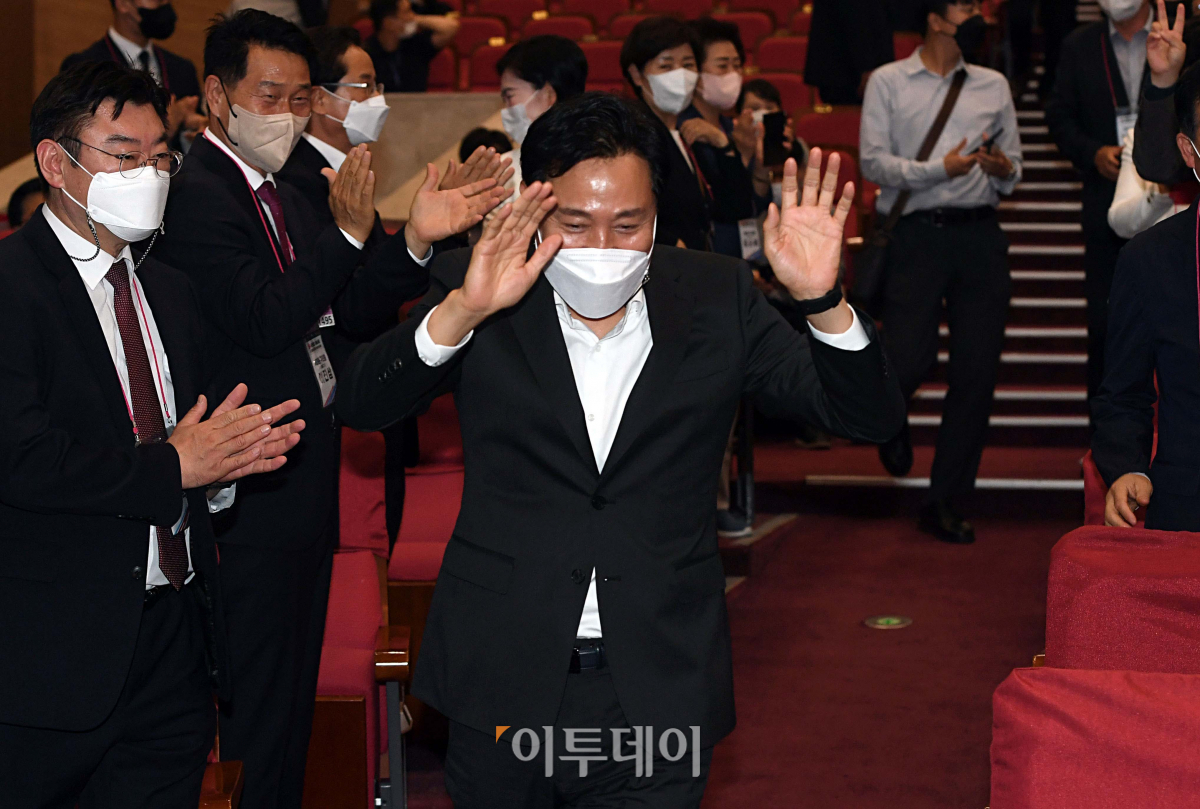 오세훈 서울시장이 9일 오후 서울 여의도 국회에서 열린 국민의힘 서울시당 6.1지방선거 당선자대회 및 워크숍에서 참석자들의 박수를 받으며 참석하고 있다.