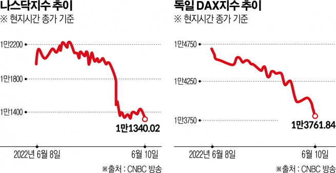 특히 유럽은 미국발 경기침체 우려에 더해 유럽중앙은행(ECB)의 11년 만의 첫 기준금리 인상 예고가 겹치면서 불안이 커졌다. ECB는 전날 통화정책회의에서 금리를 7월 25bp(1bp=0.01%포인트) 인상하고 9월엔 더 큰 폭으로 올릴 수 있다고 발표했다.