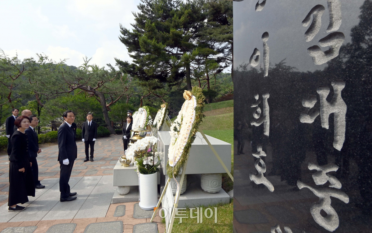 더불어민주당 우상호 비상대책위원장과 박홍근 원내대표가 13일 오전 국립현충원 고 김대중 대통령 묘역을 참배 하고 있다. 국회사진취재단