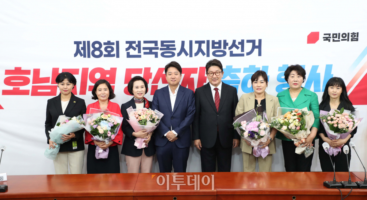 국민의힘 이준석 대표와 권성동 원내대표가 13일 서울 여의도 국회에서 열린 제8회 동시지방선거 호남 당선자 축하행사에서 참석자들과 기념촬영을 하고 있다. 왼쪽부터 전북 익산시 기초비례의원 송영자, 전북 광역비례의원 이수진, 광주시 광역비례의원 김용님, 이준석 대표, 권성동 원내대표, 전남 광역비례의원 전서현, 전북 전주시 기초비례의원 천서영, 전북 군산시 기초비례의원 윤세자.