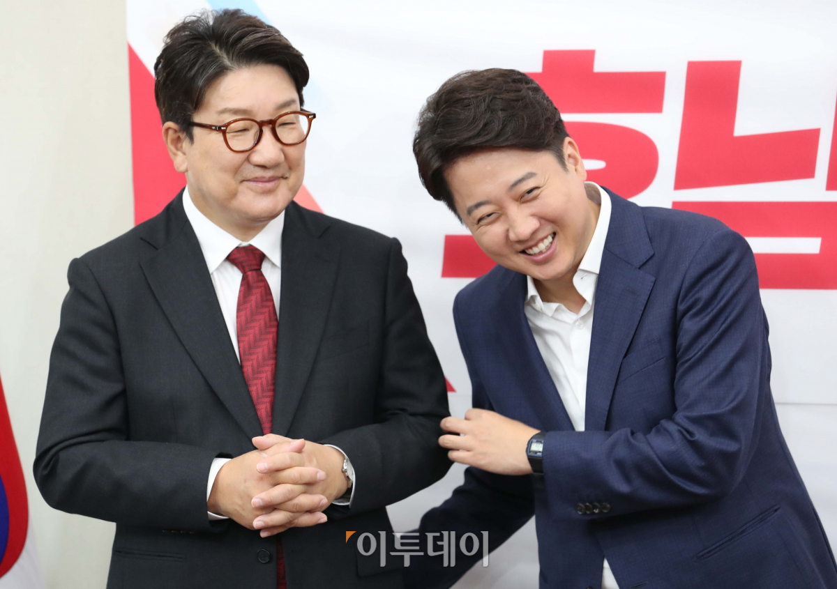 국민의힘 이준석 대표와 권성동 원내대표가 13일 서울 여의도 국회에서 열린 제8회 동시지방선거 호남 당선자 축하행사에서 이야기를 나누고 있다.