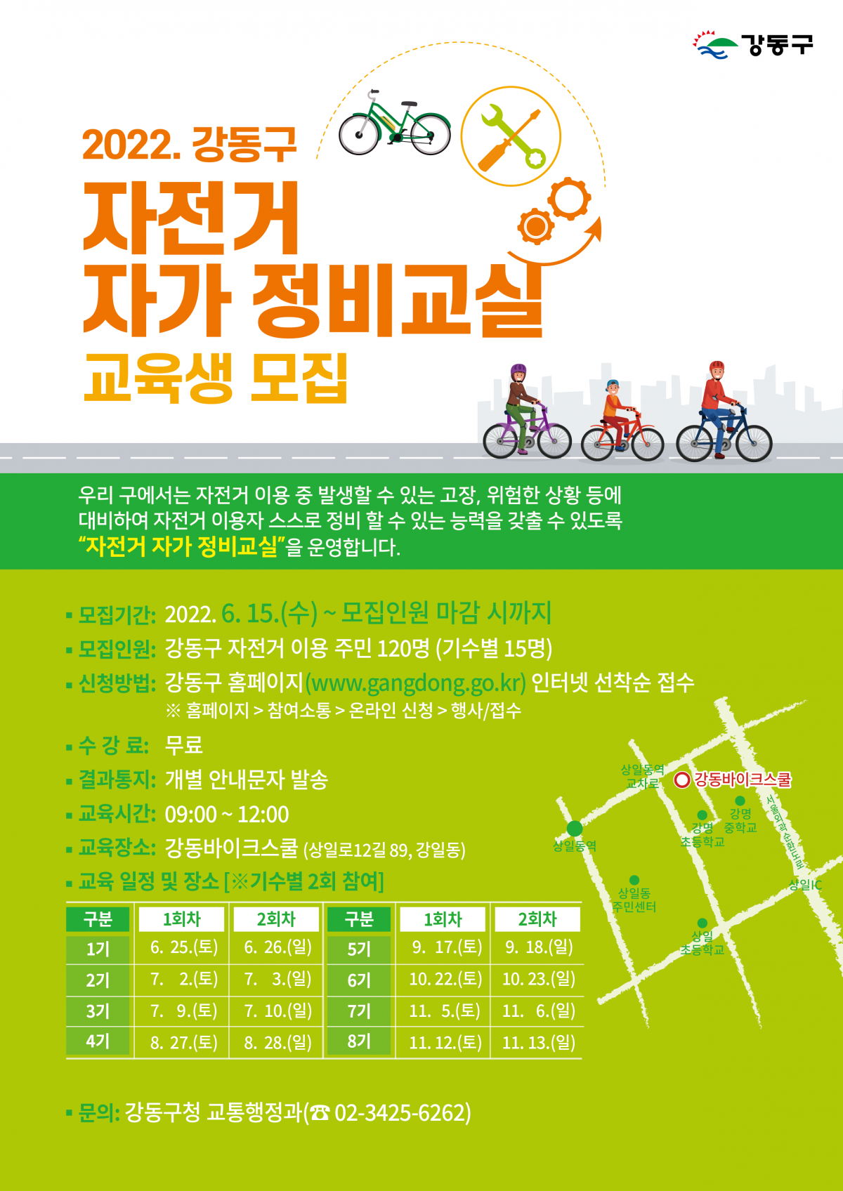 25일부터 순차적으로 총 8기에 걸쳐, 기수별 15명씩 매 2회차 교육을 진행한다. 교육 장소는 자전거 안전체험교육장 ‘강동바이크스쿨’ 실내교육장으로, 자전거 전문 정비사가 강의를 맡아 총 6시간의 실습 중심 맞춤 교육을 제공한다.