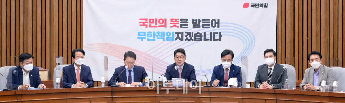 국민의힘 권성동 원내대표가 14일 오전 서울 여의도 국회에서 열린 원내대책회의에서 발언을 하고 있다.