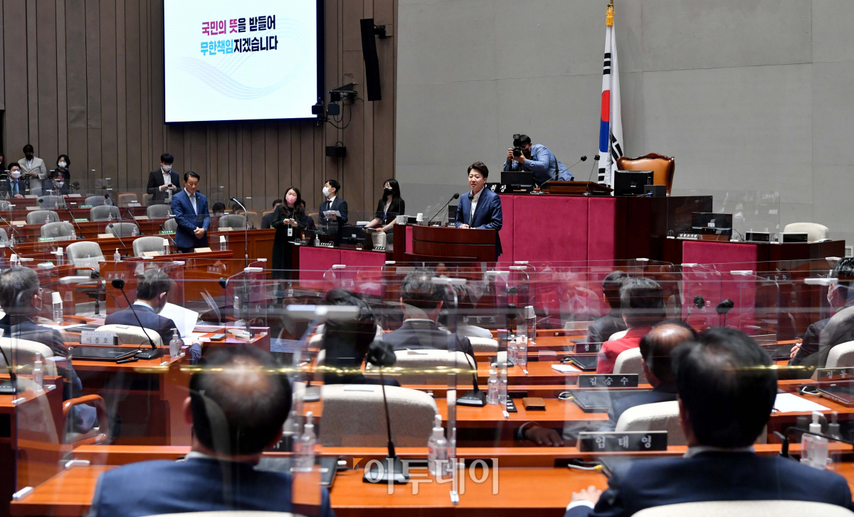 이준석 국민의힘 대표가 14일 서울 여의도 국회에서 열린 국민의힘 의원총회에서 발언하고 있다.
