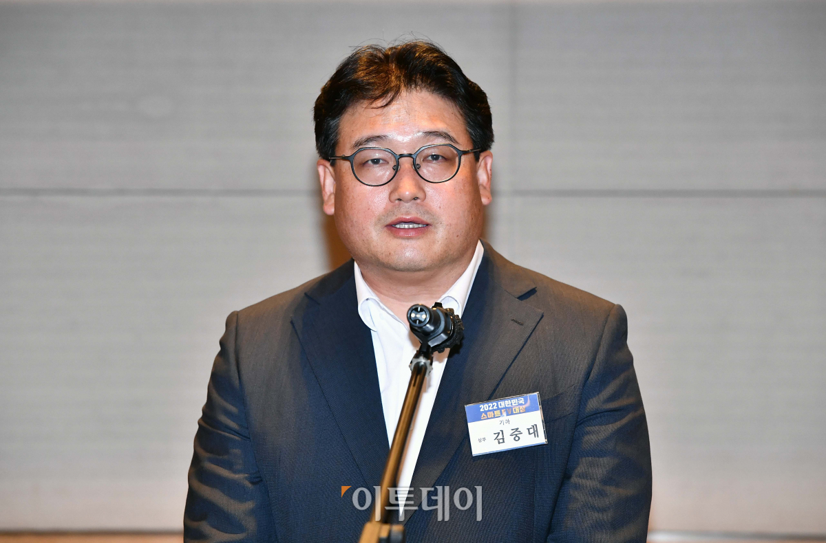 김중대 기아 상무가 15일 서울 여의도 전경련회관 컨퍼런스센터에서 열린 ‘2022 대한민국 스마트 EV 대상’ 시상식에서 EV6로 에코대상을 수상한 뒤 소감을 밝히고 있다. 이투데이가 주최한 ‘2022 대한민국 스마트 EV 대상’은 이 시대 새로운 패러다임으로 떠오른 ‘전기차’를 진단하고, 자동차 산업이 나아갈 방향성을 제언하기 위해 기획됐다.