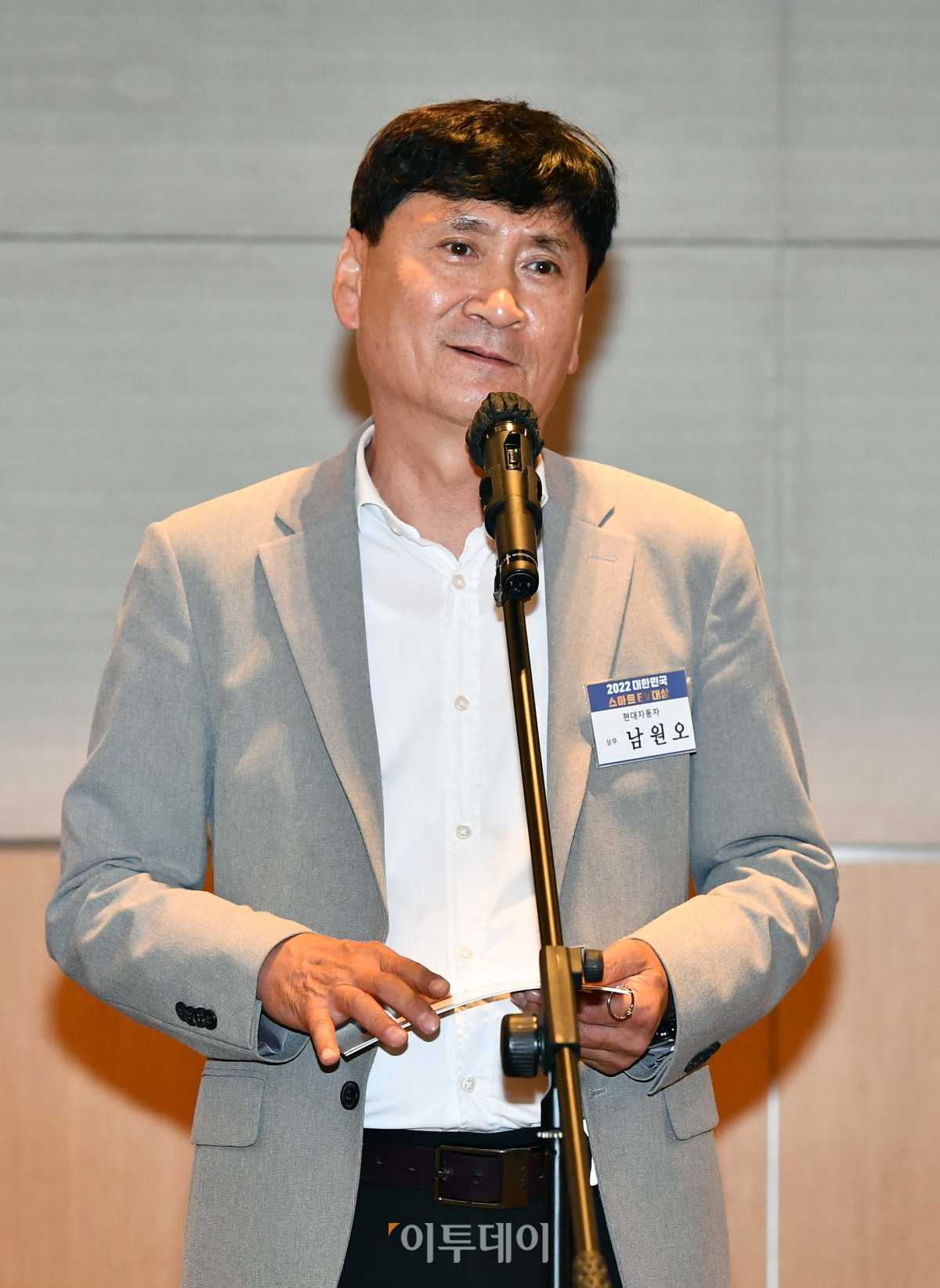 남원오 현대자동차 상무가 15일 서울 여의도 전경련회관 컨퍼런스센터에서 열린 ‘2022 대한민국 스마트 EV 대상’ 시상식에서 제네시스 GV60으로 종합대상을 수상한 뒤 소감을 밝히고 있다. 이투데이가 주최한 ‘2022 대한민국 스마트 EV 대상’은 이 시대 새로운 패러다임으로 떠오른 ‘전기차’를 진단하고, 자동차 산업이 나아갈 방향성을 제언하기 위해 기획됐다.